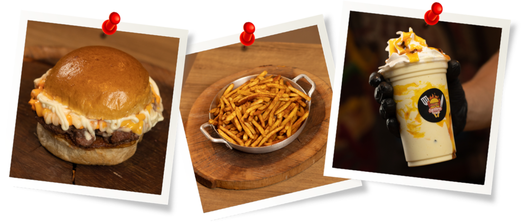 Variedade de hambúrgueres, fritas e bebidas, em clima fast-food.